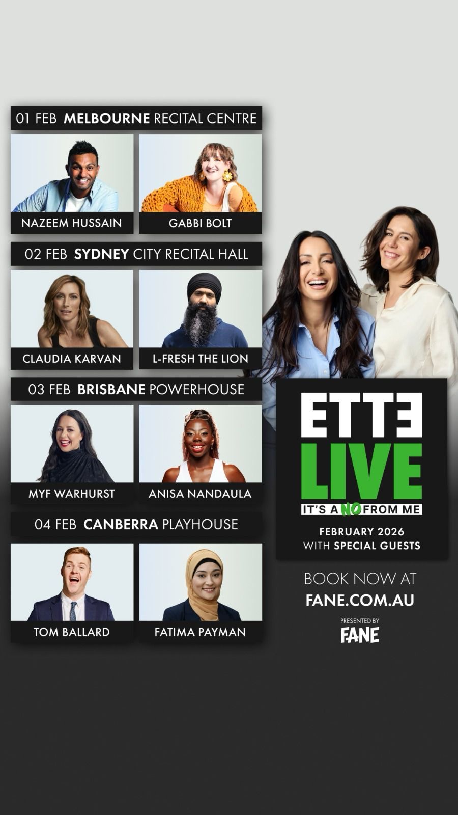 Join ETTE MEDIA’s Jan Fran and Antoinette Lattouf for their debut live show ‘IT’S A NO FROM ME’ – an evening of sharp, frank and funny witticism and criticism in a world turning to shiticism.